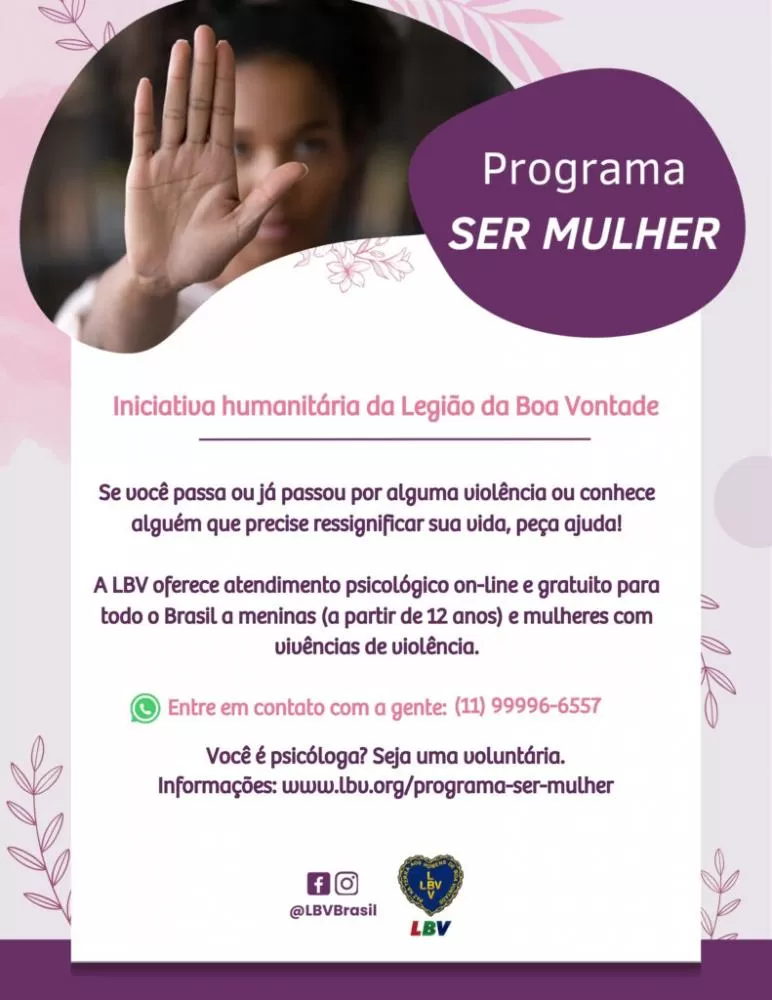 A Legião da Boa Vontade (LBV), que há mais de 75 anos atua pela valorização da Vida em todas as suas formas, reforça seu compromisso por meio do programa SER MULHER — uma iniciativa gratuita, sigilosa e acolhedora, que oferece apoio emocional e atendimento psicológico a mulheres em situação de vulnerabilidade, ajudando a fortalecer a autoestima e abrir novos caminhos.