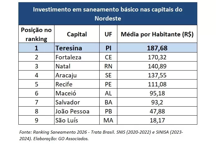 A capital piauiense também se destaca como a que mais investe em saneamento no Nordeste, com investimento médio de R$ 187,68 por habitante, segundo o ranking. Considerando apenas o ano analisado (2024), esse valor chegou a R$ 322,10 por habitante, o que representa um crescimento de aproximadamente 71,6% no volume de investimentos em relação ao período anterior, um indicador direto do ritmo acelerado de expansão e melhoria dos serviços na cidade.